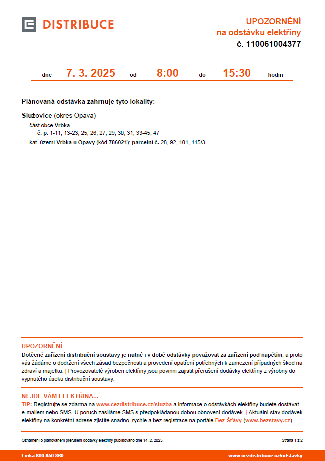 Přerušení dodávky EE - Vrbka 7.3.2025