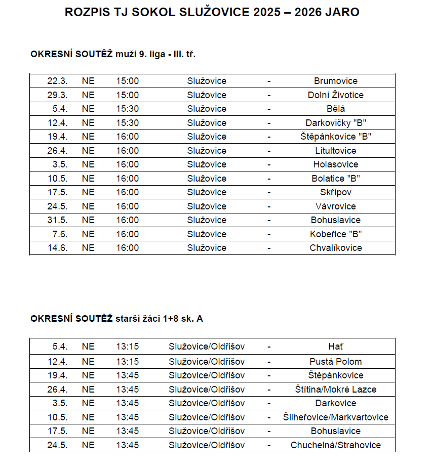 TJ SOKOL Služovice - rozpis utkání 2025 - 2026
